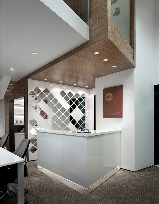 办公前台使用了一个转角桌面,不仅节省了办公空间,且使空间更具立体线条感。